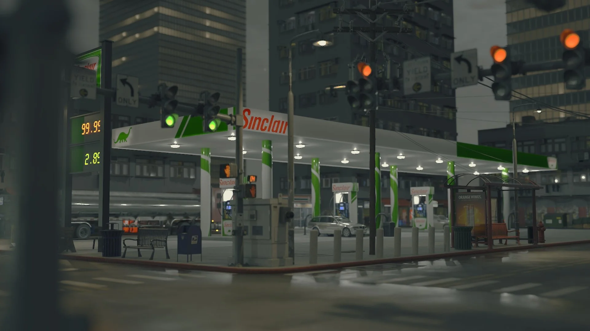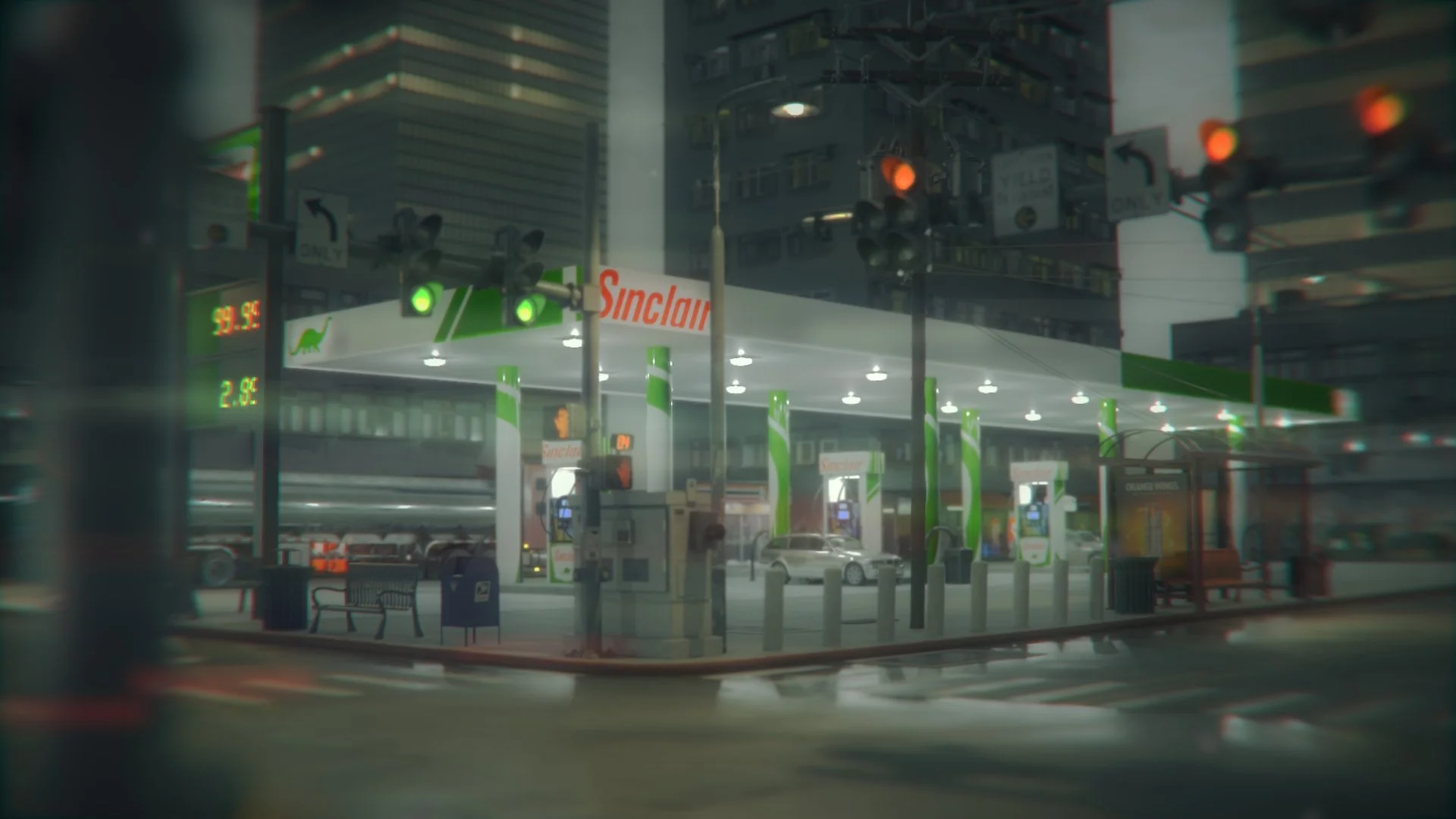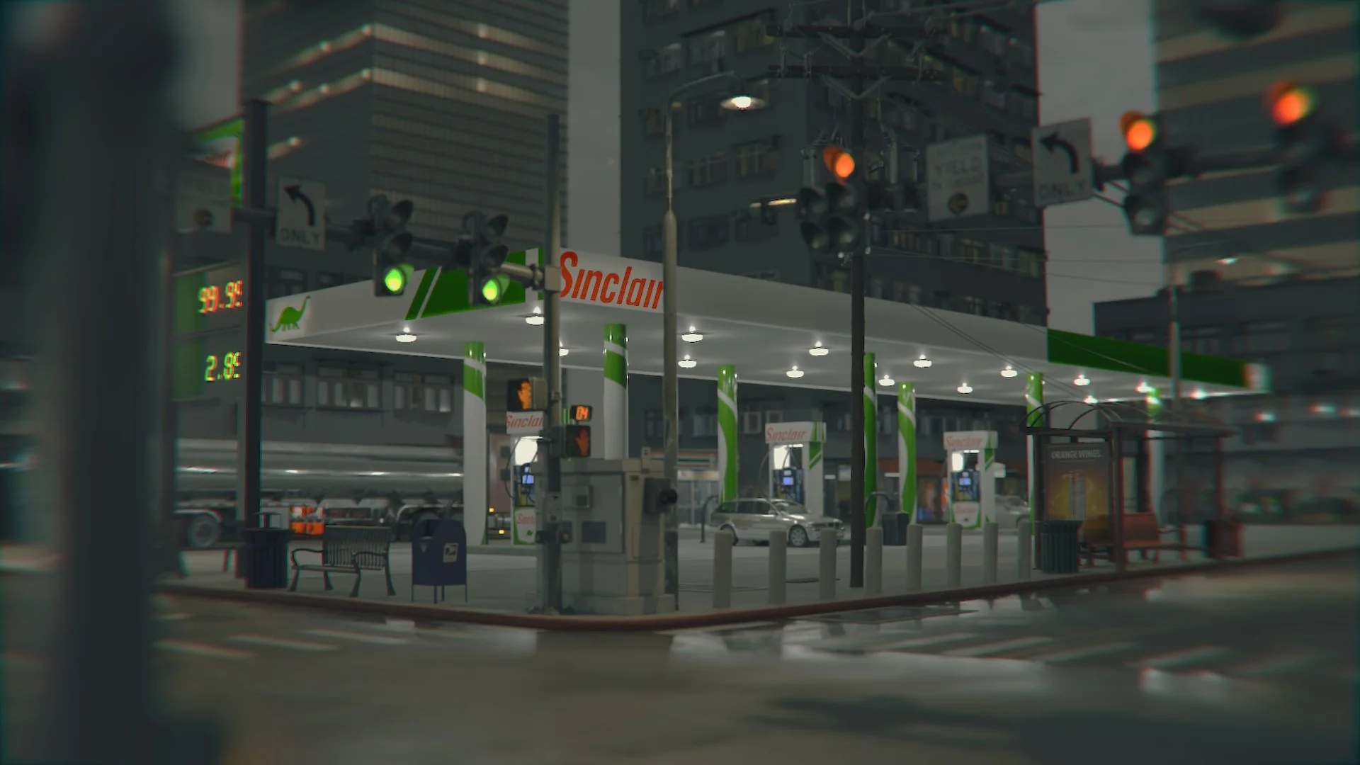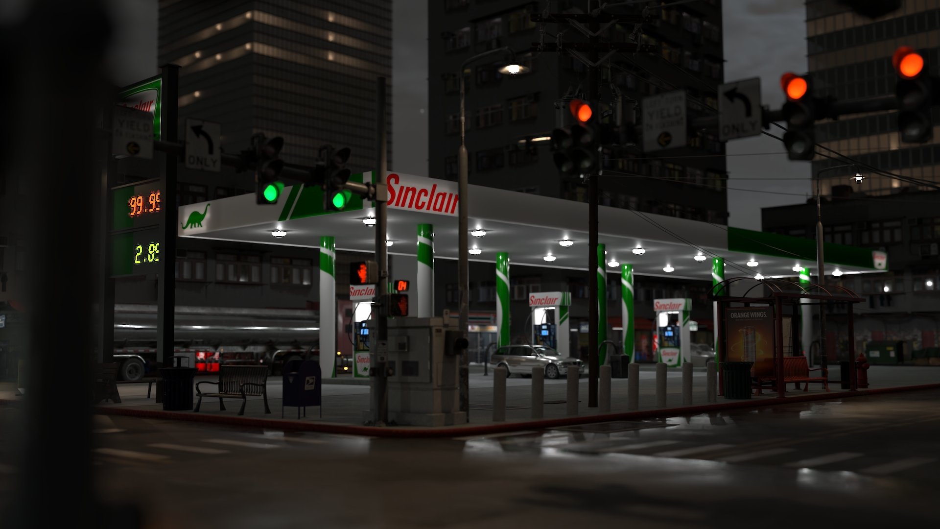 I modeled and shaded the gas station and kit-bashed the surrounding environment. The distant skyscraper is my Building Builder asset.